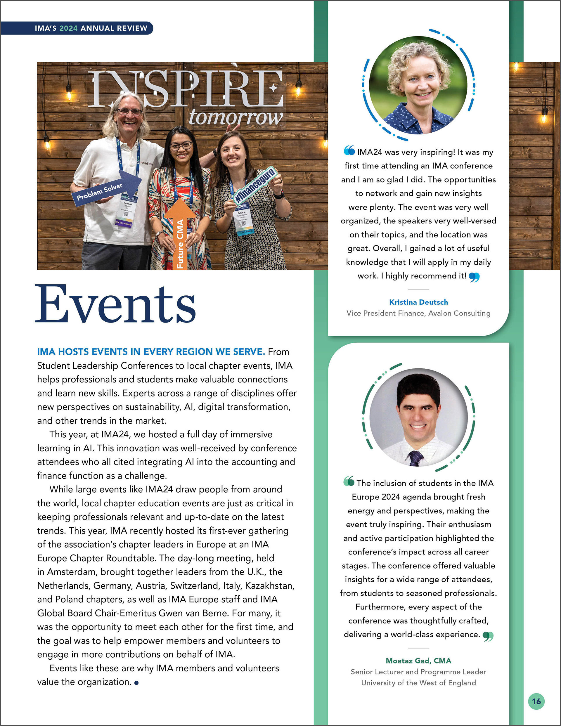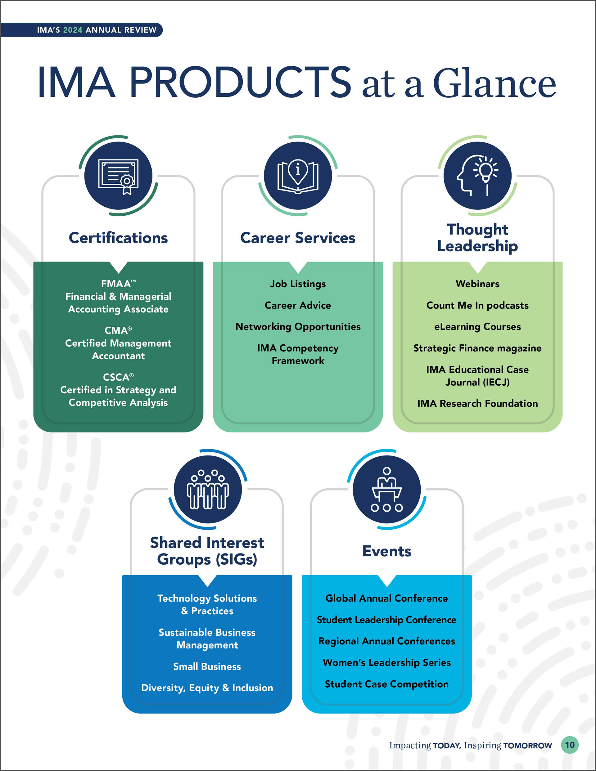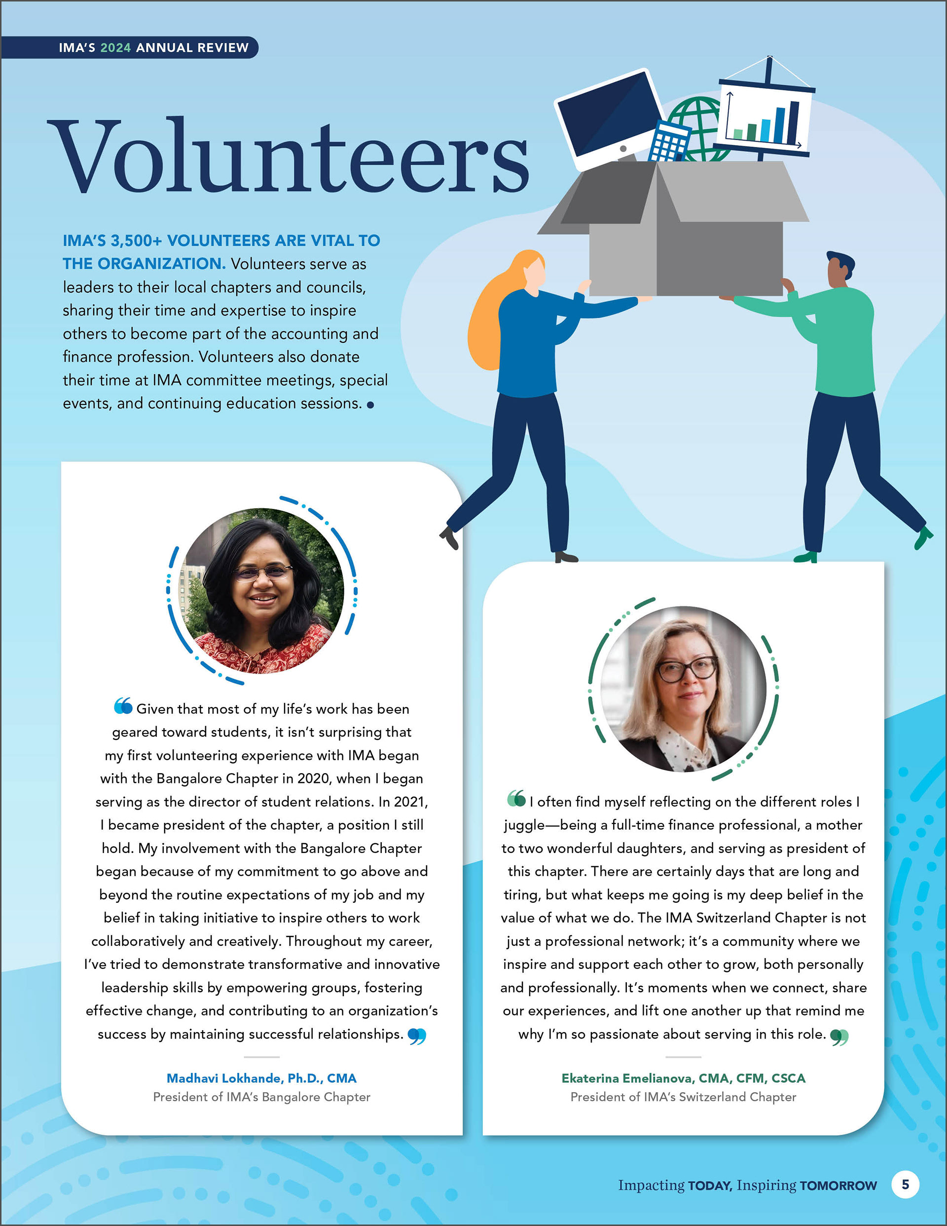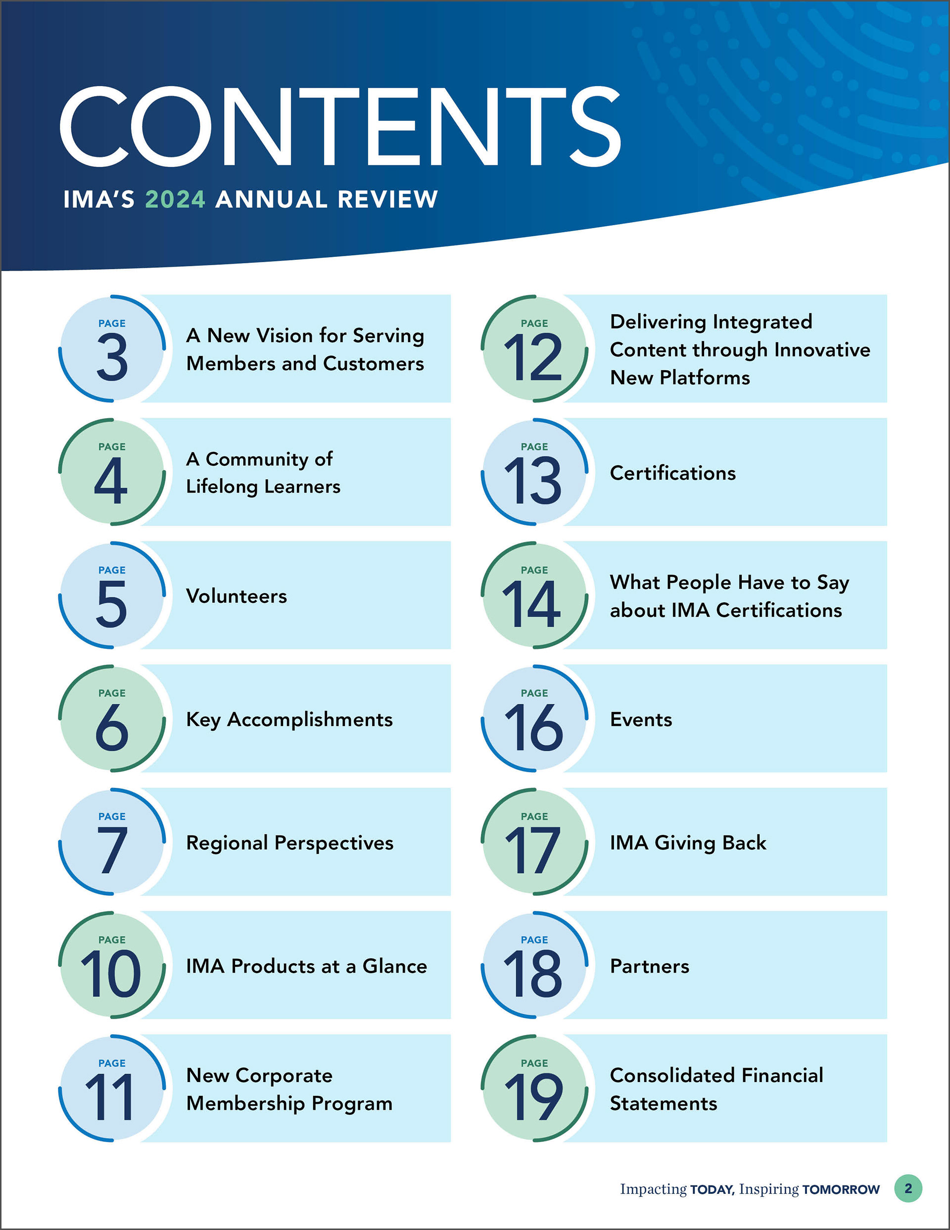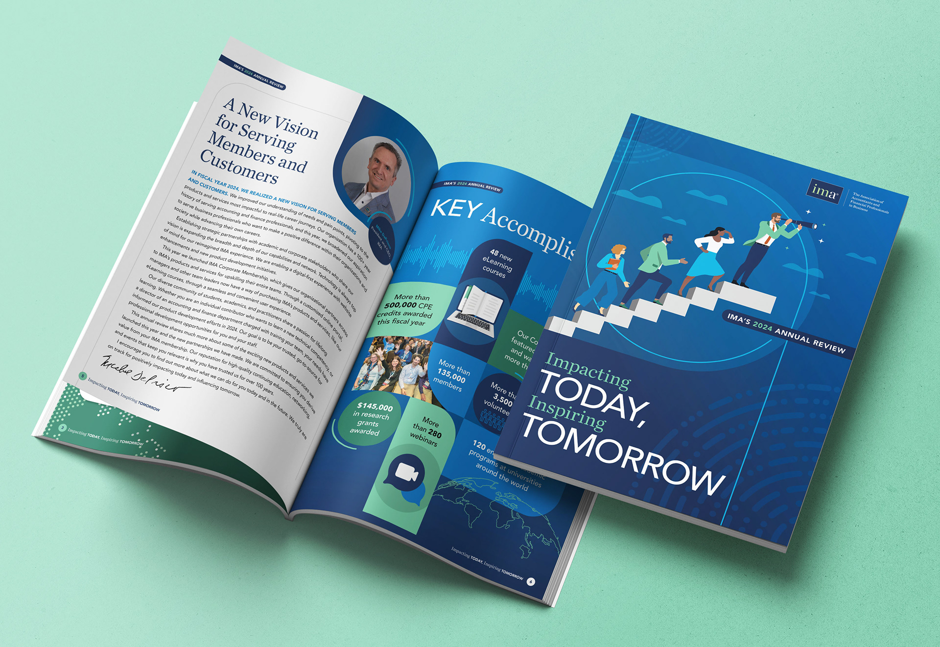 The upward motion in the cover artwork symbolizes growth and ambition, while dynamic shapes and subtle line work convey connection and innovation. A confident color palette of blues and greens establishes trust and energy, complemented by clean layouts and balanced white space to ensure clarity and readability. Together, these elements create a human-centered, future-focused publication that highlights IMA’s continued growth through innovation, education, and community impact—reinforcing its role as a global leader supporting professionals who make a difference today while shaping the future of their field.