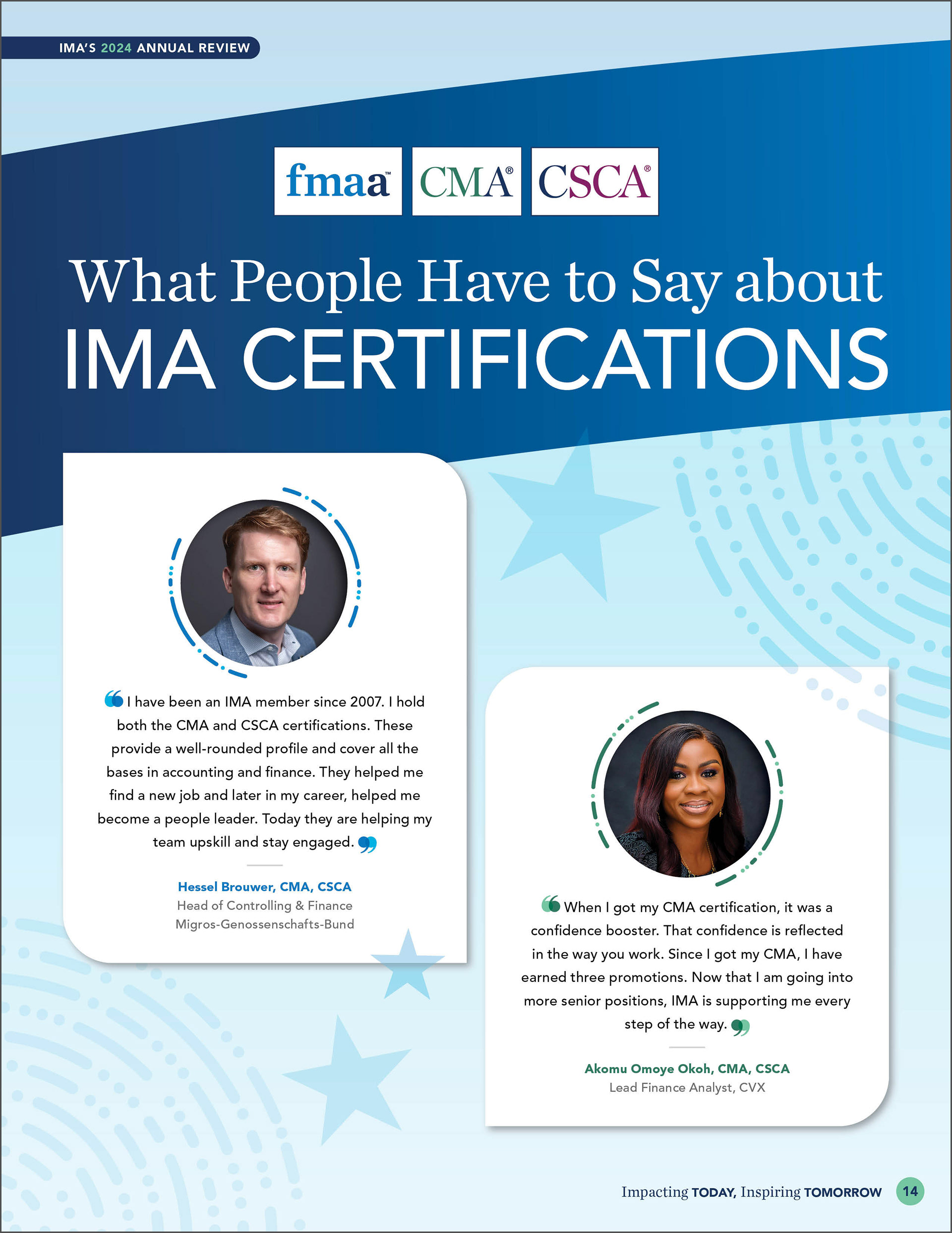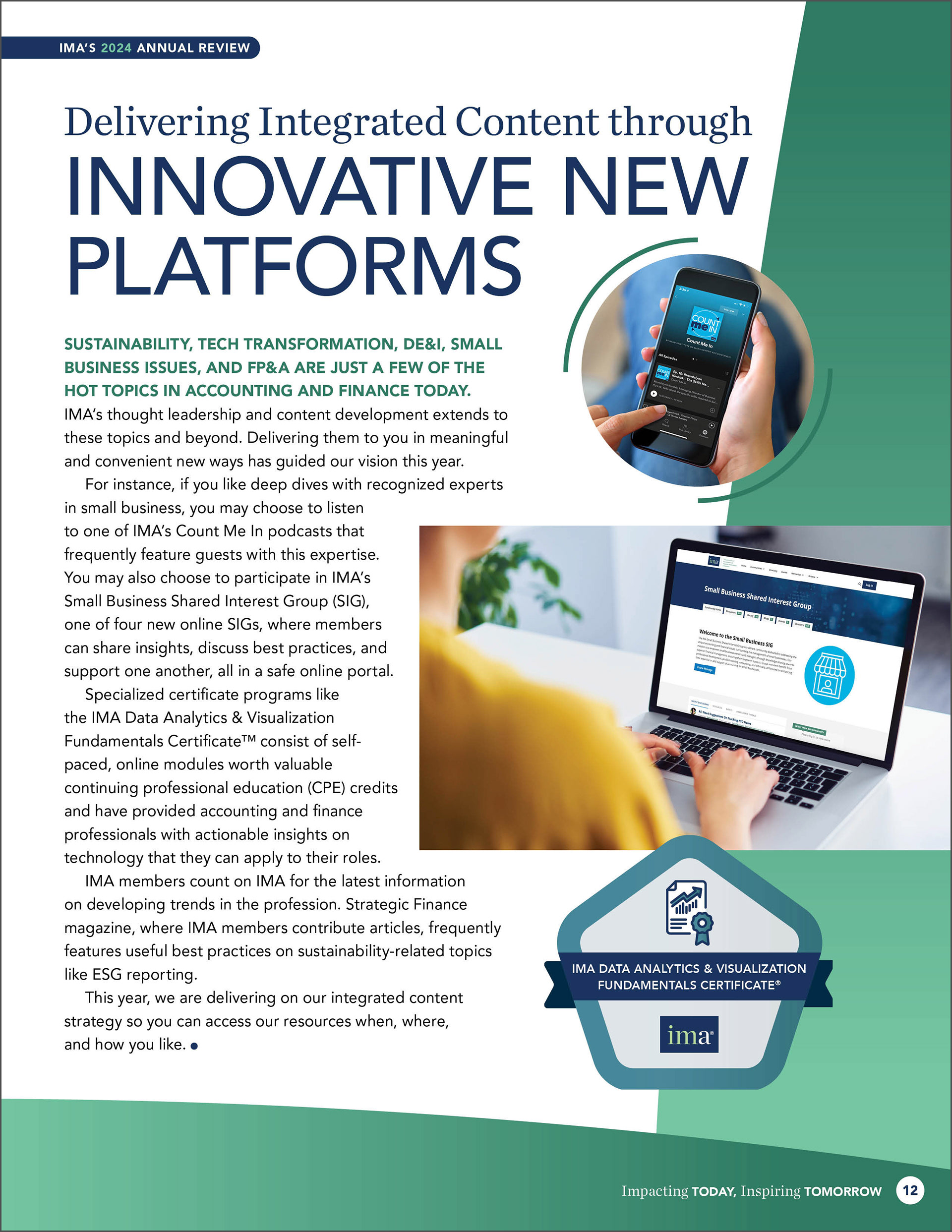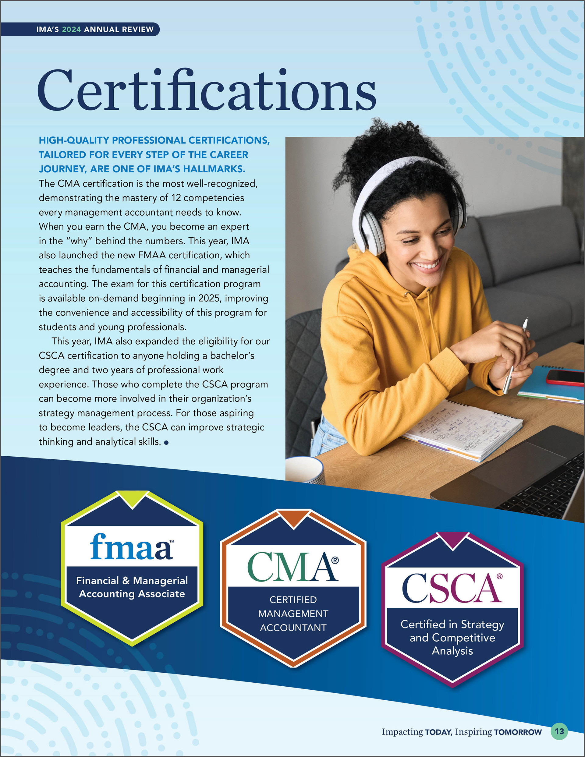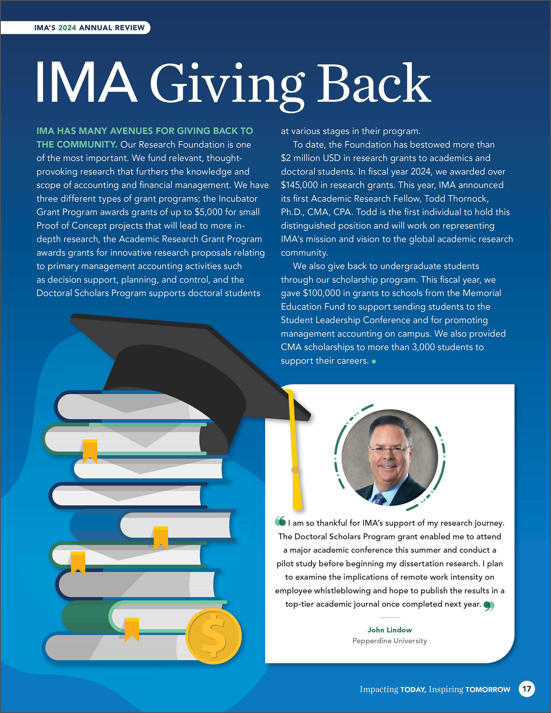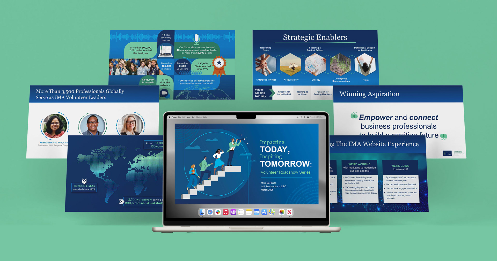 The upward motion in the cover artwork symbolizes growth and ambition, while dynamic shapes and subtle line work convey connection and innovation. A confident color palette of blues and greens establishes trust and energy, complemented by clean layouts and balanced white space to ensure clarity and readability. Together, these elements create a human-centered, future-focused publication that highlights IMA’s continued growth through innovation, education, and community impact—reinforcing its role as a global leader supporting professionals who make a difference today while shaping the future of their field.